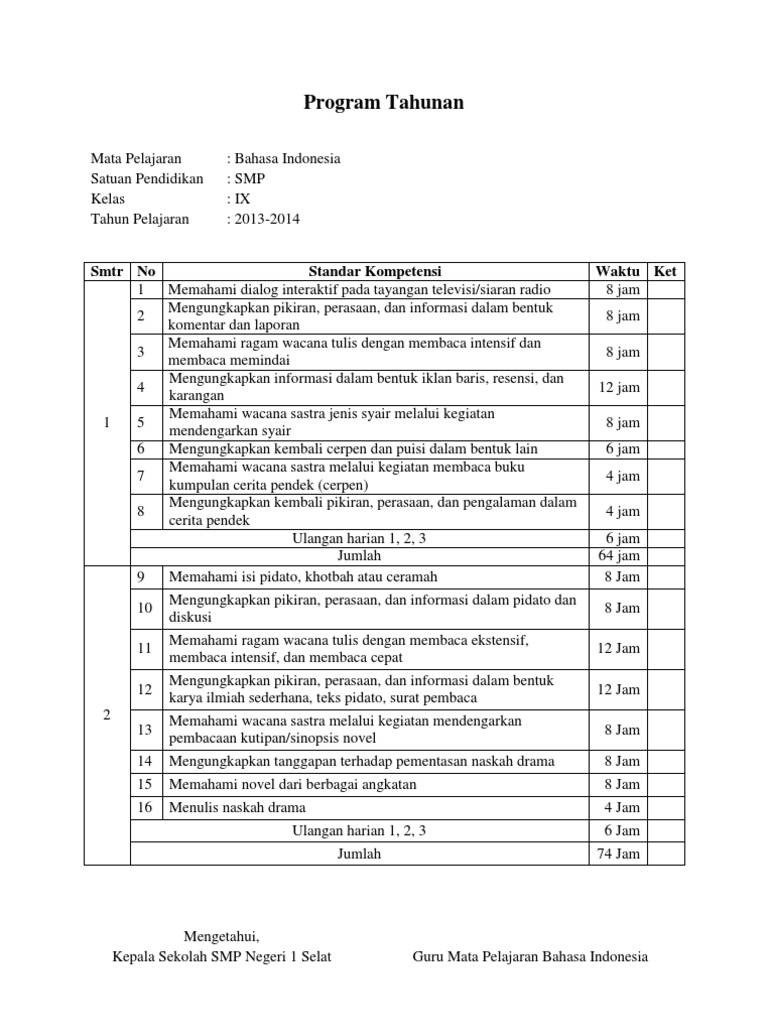 Kegiatan belajar dan mengajar untuk guru, tingkat smp / mts biasanya selalu sibuk membuat bahan belajar seperti kurikulum, rpp, dalam program tahunan. Buku bahasa indonesia revisi 2017 smp/mts buku kurikulum 2013 revisi 2017 kelas vii, viii yang mungkin anda cari saat ini,maka tepat sekali mengunjung…. 21 buku siswa bahasa indonesia kelas 9 revisi 2018.pdf. Soal uas matematika kelas 6 semester 2 kurikulum 2013 kami lengkapi dengan. Silabus bahasa indonesia kelas 9 semester 1 kurikulum 2013. Silabus bahasa indonesia kelas 7/vii, kelas 8/viii, kelas 9/ix kurikulum 13 revisi 2017/2018 ini kami sediakan dua format yakni format pdf dan docx. Silabus bahasa indonesia k13 kelas 9 terbaru ( disini) untuk silabus bahasa indonesia kelas 8 ( disini) untuk silabus bahasa indonesia kelas 7 ( disini) demikianlah artikel mengenai silabus untuk mata pelajaran bahasa indonesia kurikulum 2013 kelas 9 smp hasil revisi yang dapat saya bagikan pada kesempatan ini, semoga dapat bermanfaat buat anda. Perangkat pembelajaran prota kelas ix smp/ mts kurikulum 2013 revisi tahun 2018 mata pelajaran bahasa indonesia lebih lengkap jelas dan lengkapnya mengenai program tahunan tersebut dapat bapak dan ibu download pada link dibawah ini. Silabus bahasa indonesia kelas 9 semester 2 k13 revisi 2018, selanjutnya. Silabus merupakan rencana pembelajaran pada suatu kelompok mata pelajaran tertentu. Silabus ini sudah direvisi sesuai dengan tahun pelajaran 2017/2018. Demikian artikel mengenai silabus untuk mata pelajaran bahasa indonesia kurikulum 2013 kelas 7,8 dan 9 hasil revisi yang dapat saya bagikan pada kesempatan ini, semoga dapat bermanfaat buat anda yang membutuhkannya. 21 buku siswa bahasa indonesia kelas 9 revisi 2018.pdf.